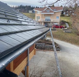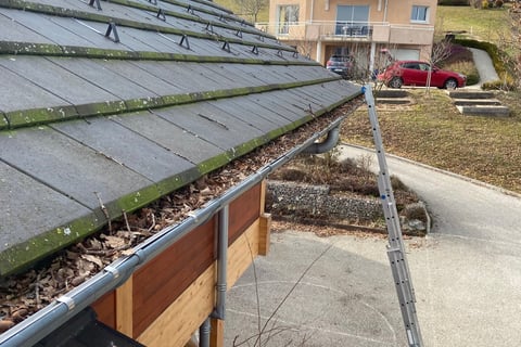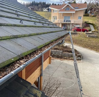 Ici, nous avons effectué un nettoyage complet des gouttières obstruées par des feuilles et débris.